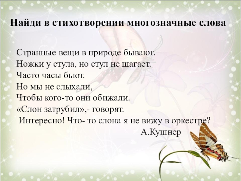 Найди в стихотворении многозначные слова   Странные вещи в природе бывают.Ножки у стула, но стул не