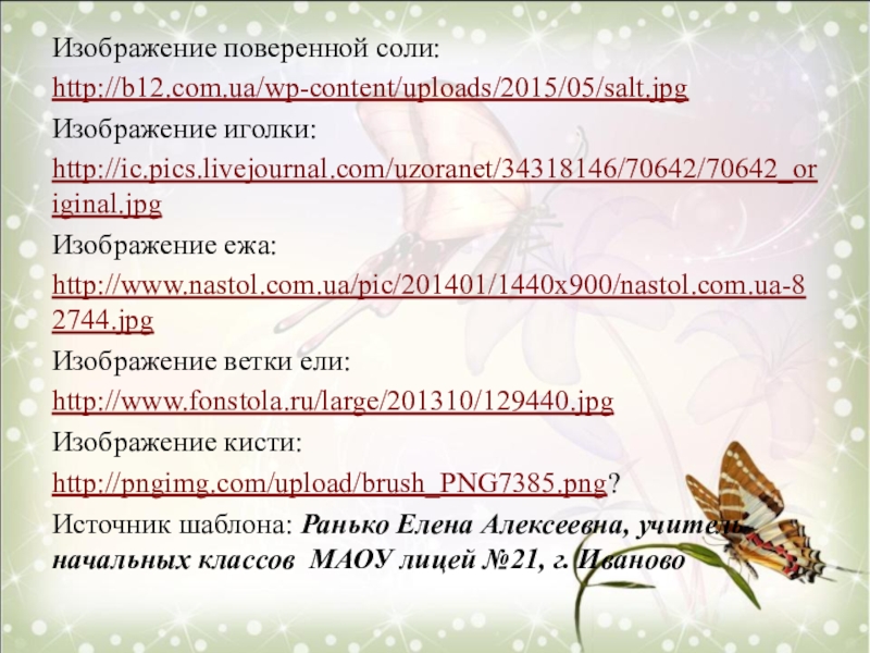 Изображение поверенной соли:http://b12.com.ua/wp-content/uploads/2015/05/salt.jpgИзображение иголки:http://ic.pics.livejournal.com/uzoranet/34318146/70642/70642_original.jpgИзображение ежа:http://www.nastol.com.ua/pic/201401/1440x900/nastol.com.ua-82744.jpgИзображение ветки ели:http://www.fonstola.ru/large/201310/129440.jpgИзображение кисти:http://pngimg.com/upload/brush_PNG7385.png?Источник шаблона: Ранько Елена Алексеевна, учитель начальных классов МАОУ лицей