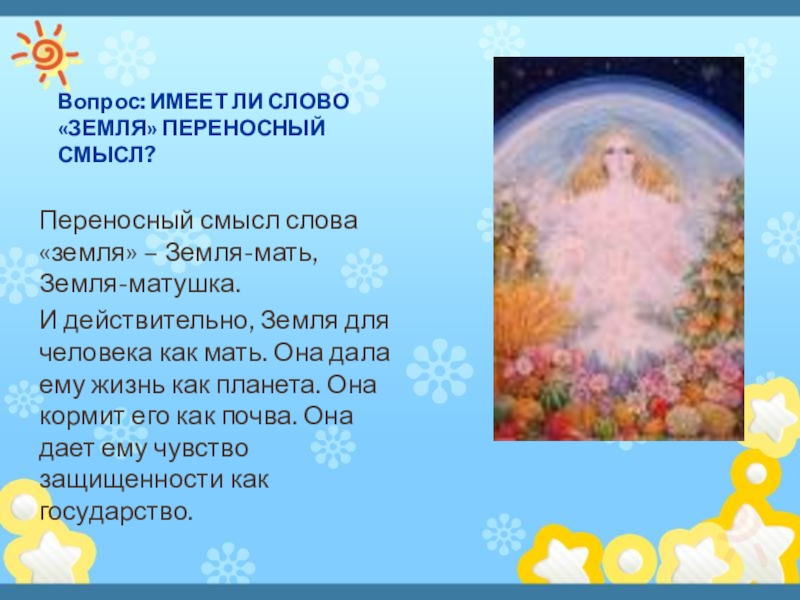 Слайд 9Вопрос: ИМЕЕТ ЛИ СЛОВО «ЗЕМЛЯ» ПЕРЕНОСНЫЙ СМЫСЛ?