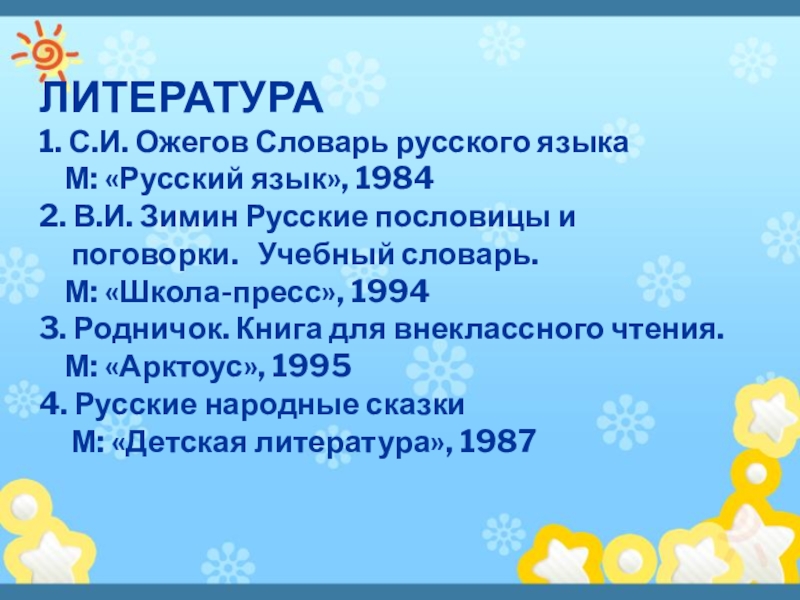 В.И. Зимин Русские пословицы и поговорки. Учебный словарь. М: «Школа-пресс», 1994 3. Родничок. Книга для внеклассного чтения. М: «Арктоус», 1995 4. Русские народные сказки М: «Детская литература», 1987