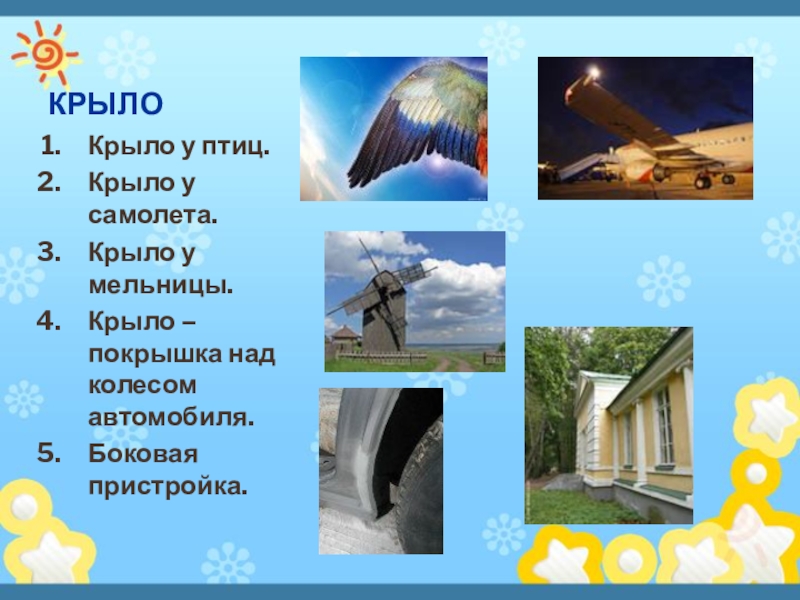 КРЫЛОКрыло у птиц.Крыло у самолета.Крыло у мельницы.Крыло – покрышка над колесом автомобиля.Боковая пристройка.
