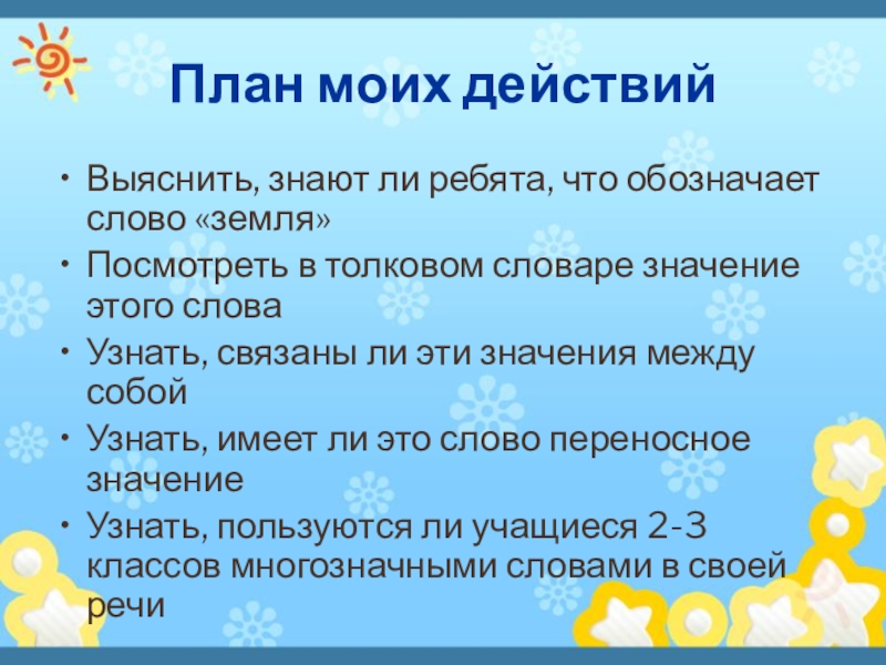 План моих действийВыяснить, знают ли ребята, что обозначает слово «земля»Посмотреть в толковом словаре значение этого словаУзнать, связаны