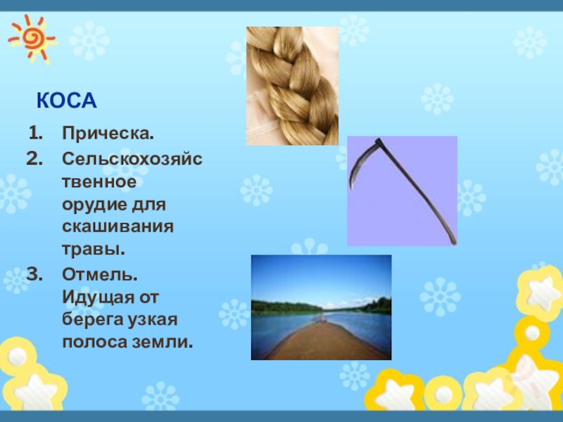 КОСАПрическа.Сельскохозяйственное орудие для скашивания травы.Отмель. Идущая от берега узкая полоса земли.