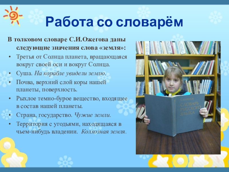 Работа со словарёмВ толковом словаре С.И.Ожегова даны следующие значения слова «земля»:Третья от Солнца планета, вращающаяся вокруг своей