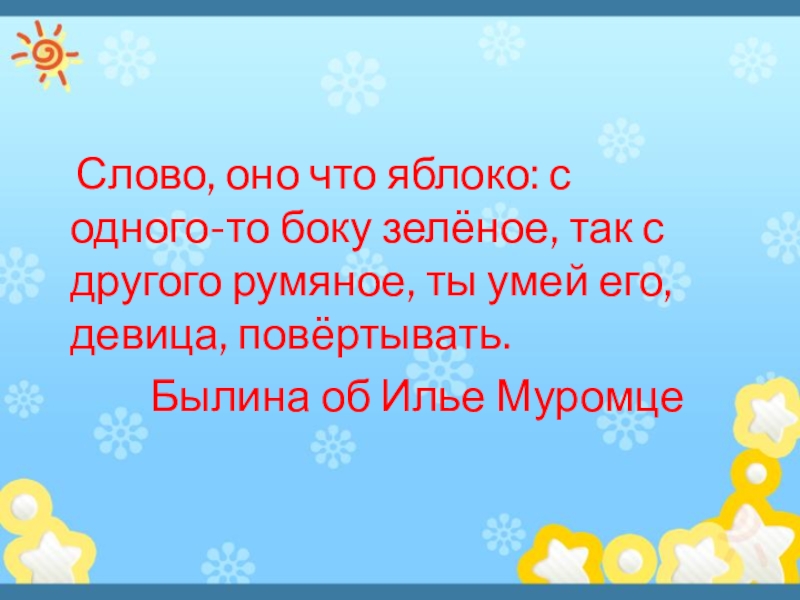 Слово, оно что яблоко: с одного-то боку зелёное, так с другого румяное, ты умей его, девица, повёртывать. Былина об Илье Муромце