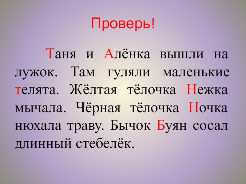 Проверь!   Таня и Алёнка вышли на лужок. Там гуляли маленькие телята. Жёлтая тёлочка Нежка мычала.