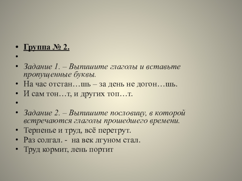 Задание 2. – Выпишите пословицу, в которой встречаются глаголы прошедшего времени.