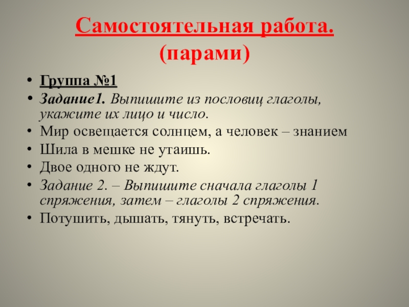 Задание1. Выпишите из пословиц глаголы, укажите их