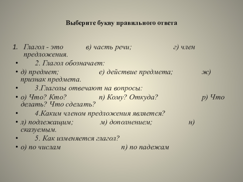 - Какого вида бывают глаголы? (Совершенного: действие уже сделано, закончено или будет закончено что сделать? Несовершенного: действие не закончено что делает?)