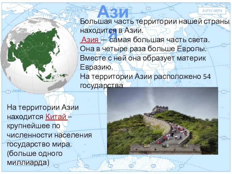 На территории Азии находится Китай – крупнейшее по численности населения государство мира. (больше одного миллиарда)