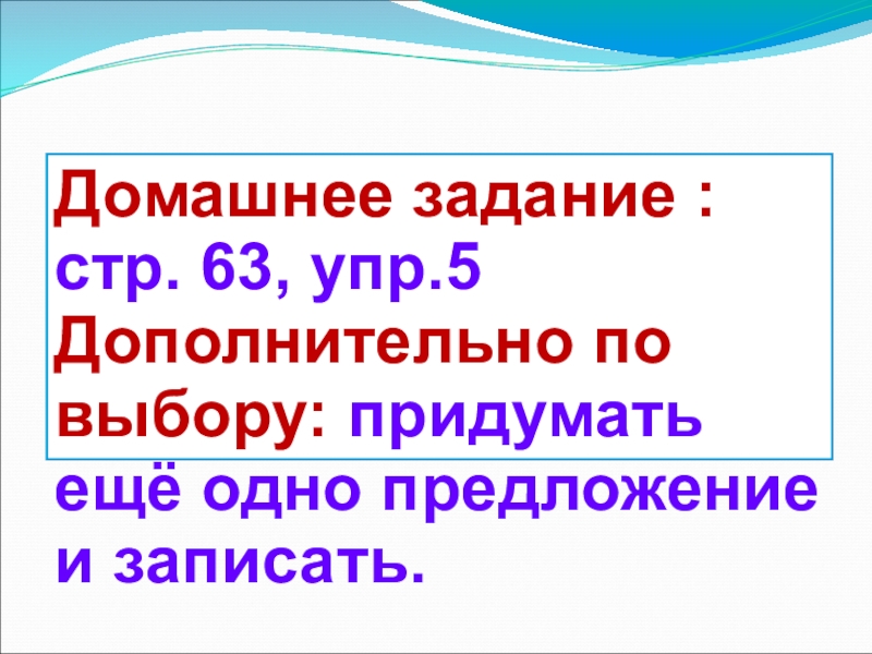 Домашнее задание : стр. 63, упр.5Дополнительно по выбору: придумать ещё одно предложение и записать.