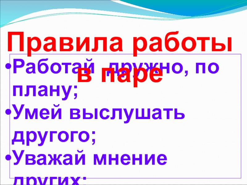 Работай дружно, по плану;Умей выслушать другого;Уважай мнение других;Не согласен с мнением других – доказывай свою точку зрения.Правила