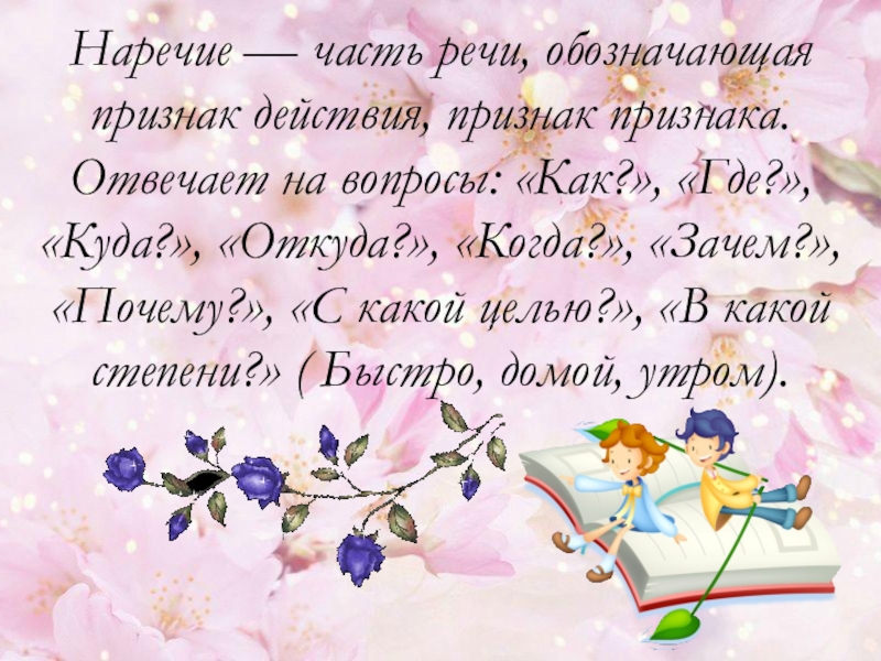 Слайд 8Наречие — часть речи, обозначающая признак действия, признак признака.