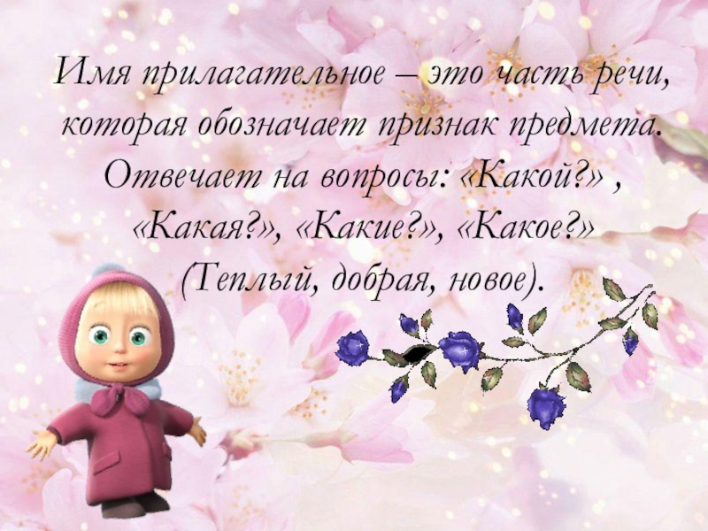 Слайд 4Имя прилагательное – это часть речи, которая обозначает признак предмета. Отвечает