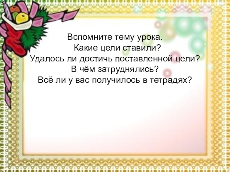 Вспомните тему урока.  Какие цели ставили? Удалось ли достичь поставленной цели? В чём затруднялись? Всё ли