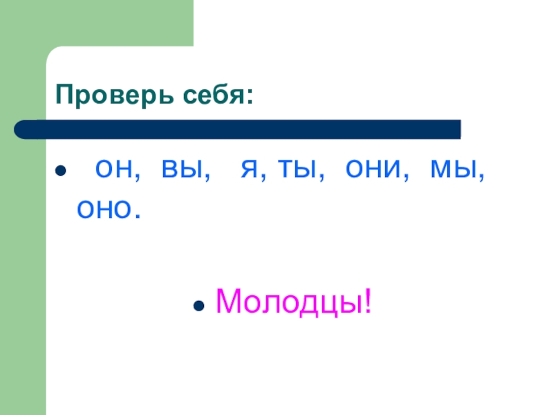 Проверь себя: он, вы,  я, ты, они, мы, оно.Молодцы!