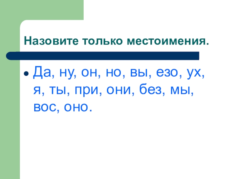 Назовите только местоимения.Да, ну, он, но, вы, езо, ух, я, ты, при, они, без, мы, вос, оно.
