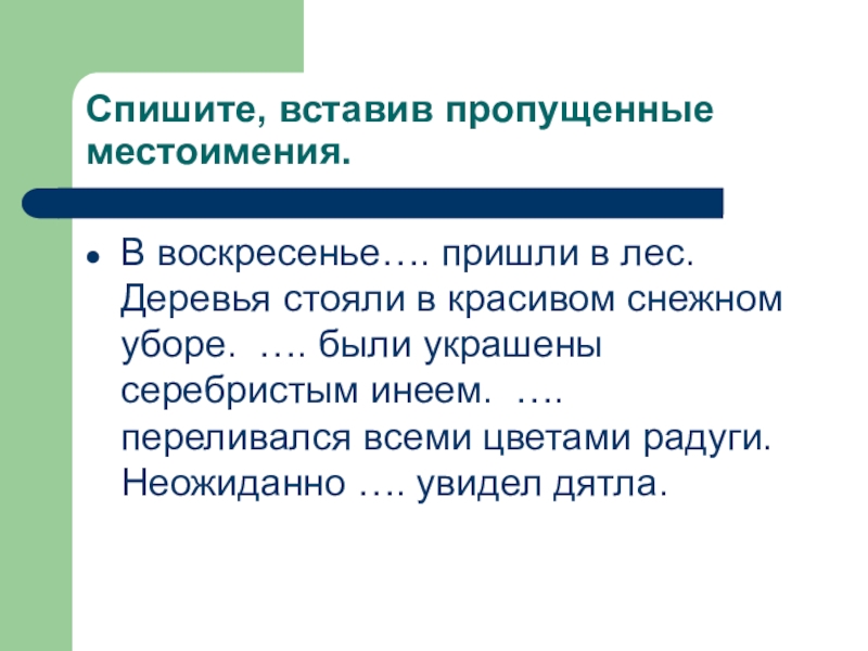 Спишите, вставив пропущенные местоимения.В воскресенье…. пришли в лес. Деревья стояли в красивом снежном уборе. …. были украшены