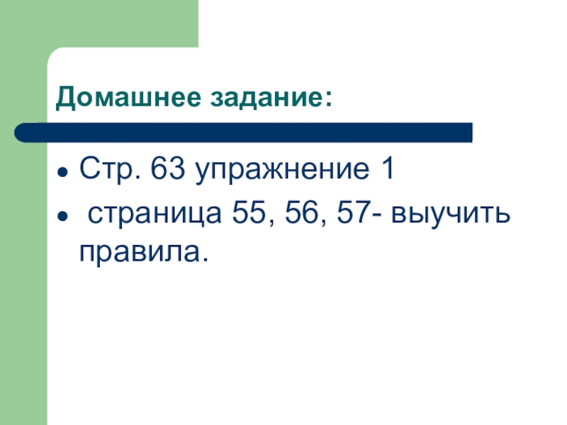 Домашнее задание:Стр. 63 упражнение 1 страница 55, 56, 57- выучить правила.