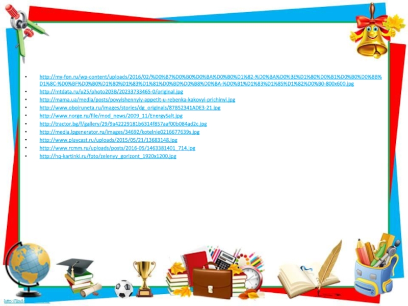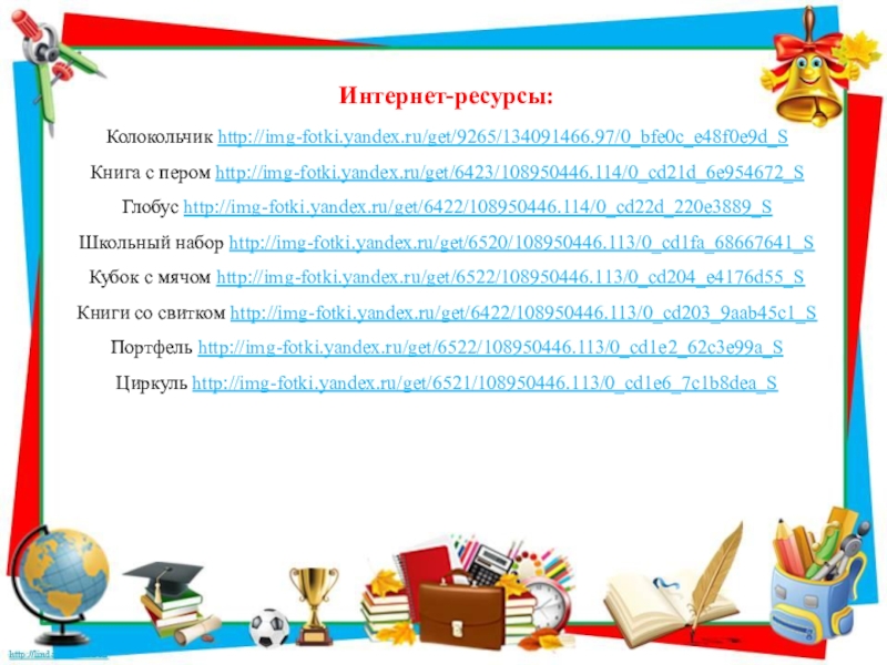 Интернет-ресурсы:Колокольчик http://img-fotki.yandex.ru/get/9265/134091466.97/0_bfe0c_e48f0e9d_S Книга с пером http://img-fotki.yandex.ru/get/6423/108950446.114/0_cd21d_6e954672_S Глобус http://img-fotki.yandex.ru/get/6422/108950446.114/0_cd22d_220e3889_S Школьный набор http://img-fotki.yandex.ru/get/6520/108950446.113/0_cd1fa_68667641_S Кубок с мячом http://img-fotki.yandex.ru/get/6522/108950446.113/0_cd204_e4176d55_S Книги со
