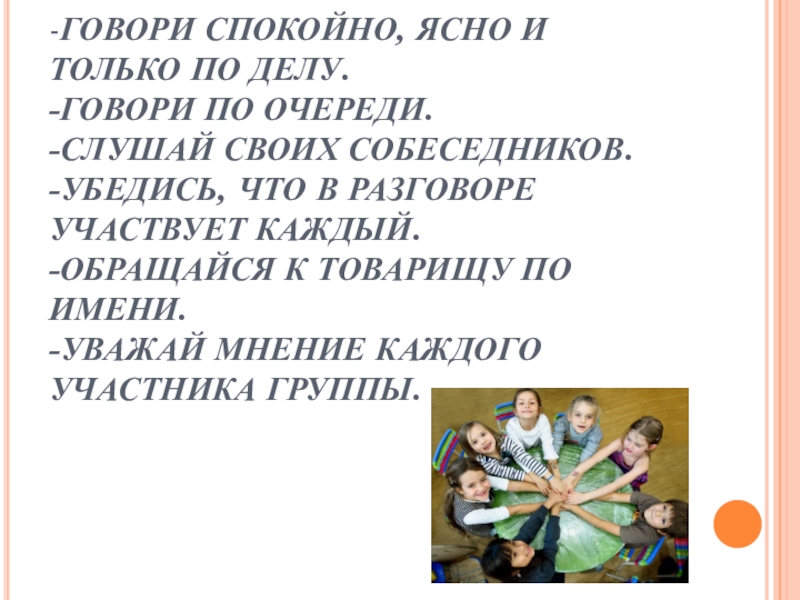 ЧТО В РАЗГОВОРЕ УЧАСТВУЕТ КАЖДЫЙ. -ОБРАЩАЙСЯ К ТОВАРИЩУ ПО ИМЕНИ. -УВАЖАЙ МНЕНИЕ КАЖДОГО УЧАСТНИКА ГРУППЫ.