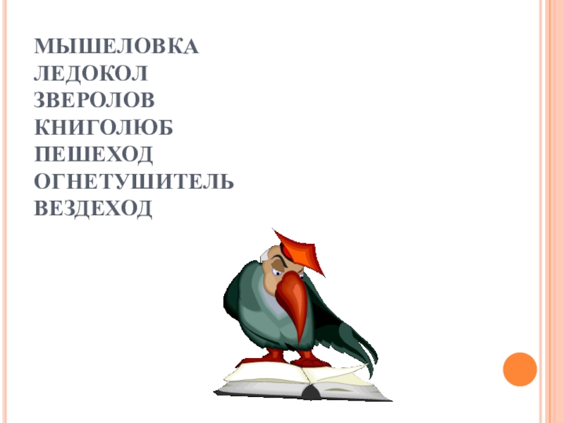 Слайд 5МЫШЕЛОВКА ЛЕДОКОЛ ЗВЕРОЛОВ КНИГОЛЮБ ПЕШЕХОД ОГНЕТУШИТЕЛЬ ВЕЗДЕХОД