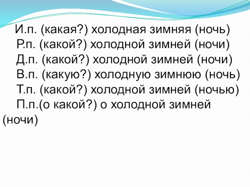 И.п. (какая?) холодная зимняя (ночь)  Р.п. (какой?) холодной зимней (ночи)