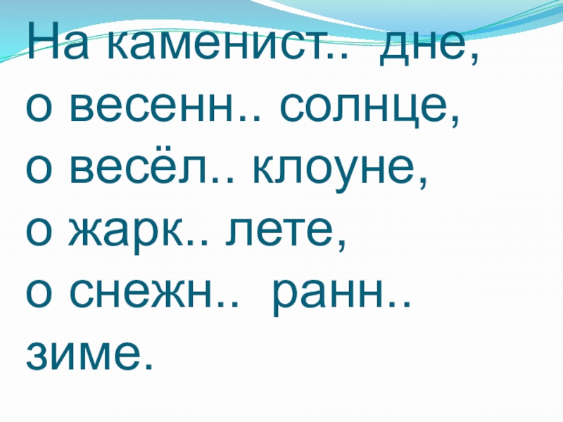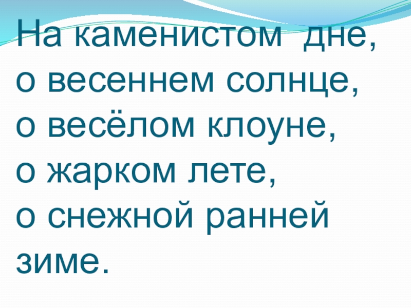 На каменист.. дне, о весенн.. солнце, о весёл.. клоуне, о жарк.. лете, о снежн.. ранн.. зиме.