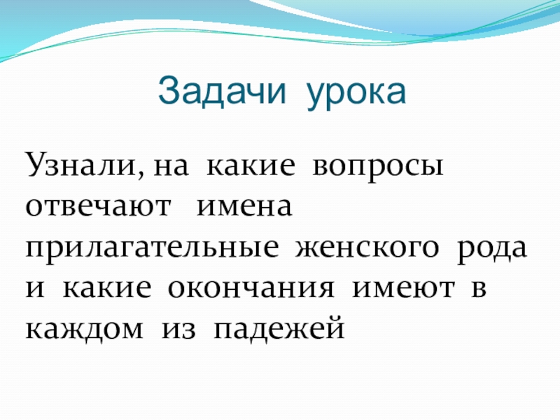 Задачи урокаУзнали, на какие вопросы отвечают  имена прилагательные женского рода и какие окончания имеют в каждом