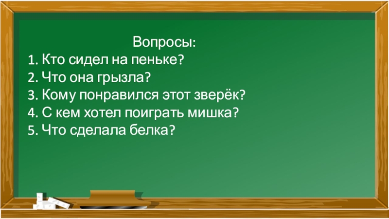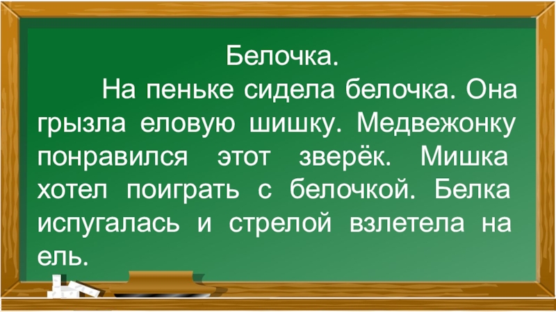 Вопросы по тексту:- О ком говорится в тексте?- Почему рассказ называется «Белочка»?- Почему белочка убежала?- Докажите словами