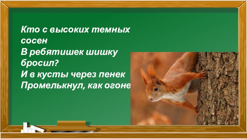 Кто с высоких темных сосенВ ребятишек шишку бросил?И в кусты через пенекПромелькнул, как огонек?