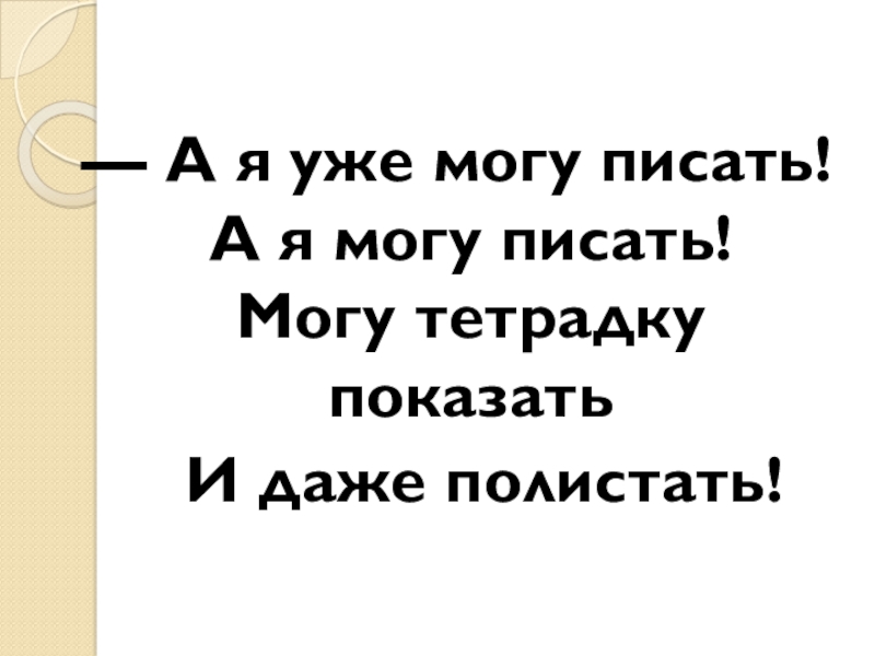 Слайд 6— А я уже могу писать! А я могу писать! Могу тетрадку показать