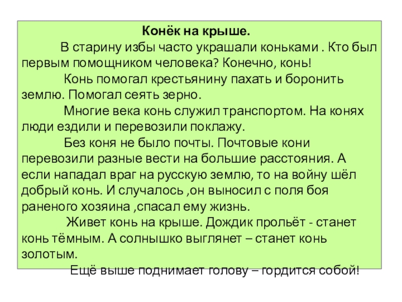 Презентация, доклад по русскому языку на тему Изложение Конёк на крыше (3 класс).