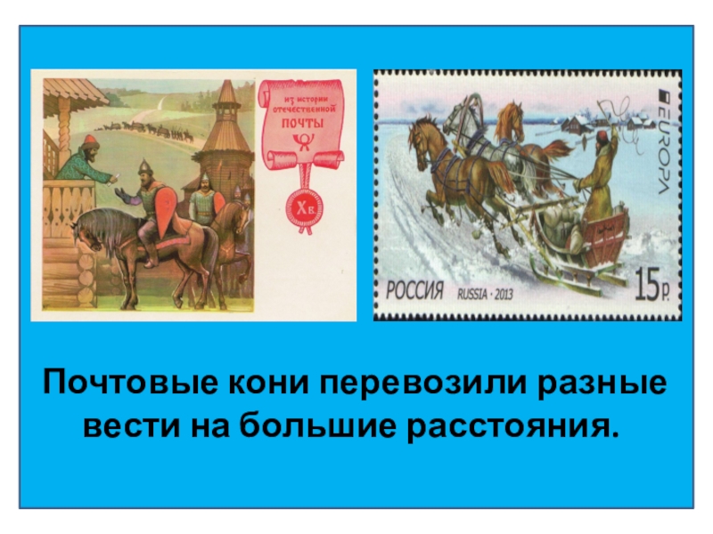 Слайд 4Почтовые кони перевозили разные вести на большие расстояния.