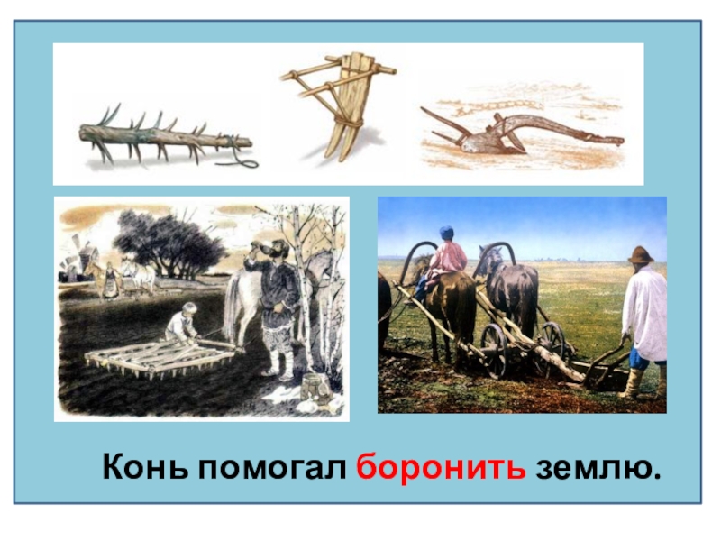 Конь помогал крестьянину пахать и боронить землю. Помогал сеять зерно.