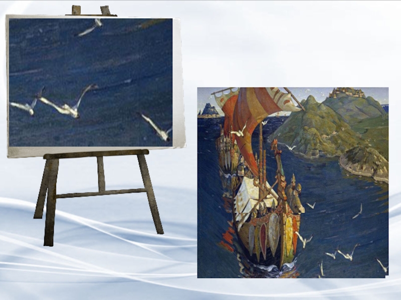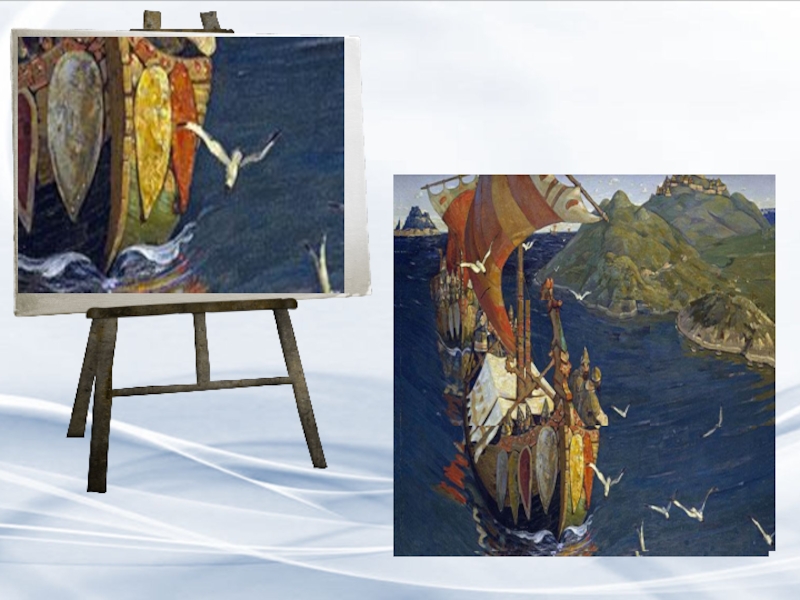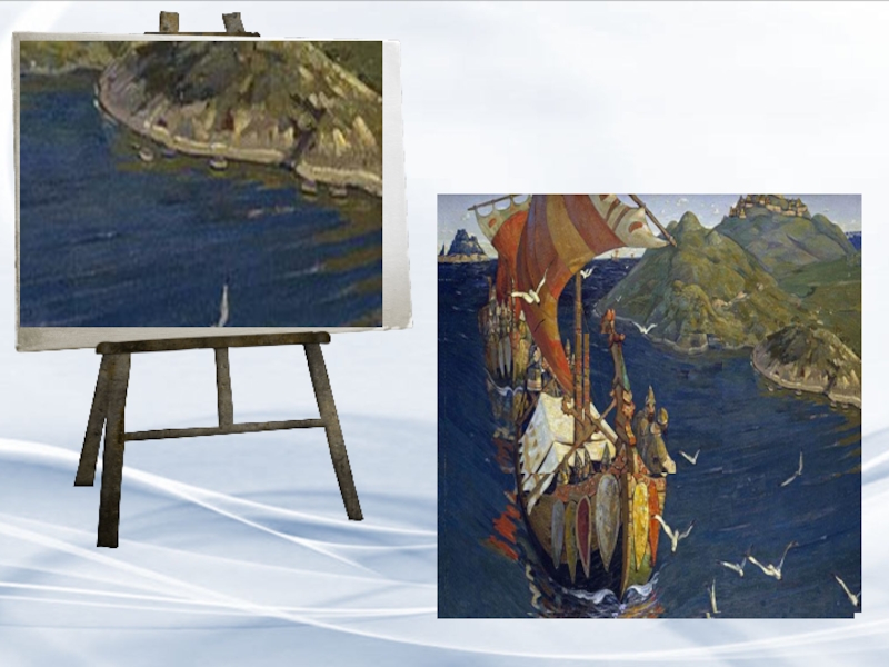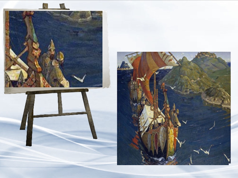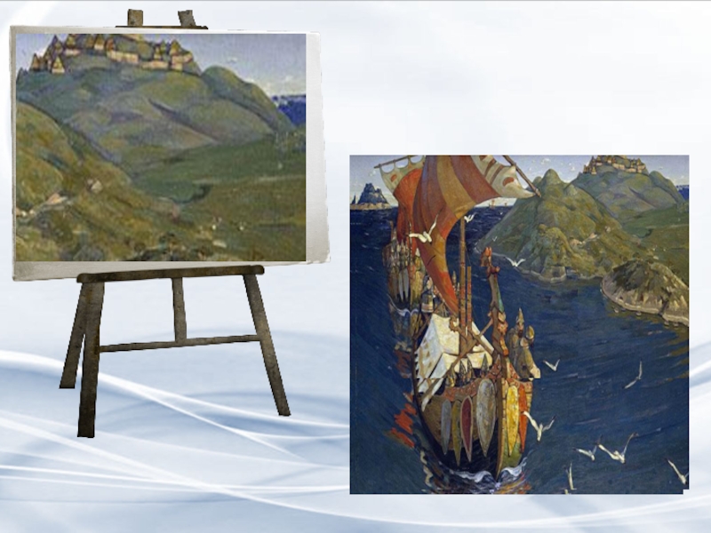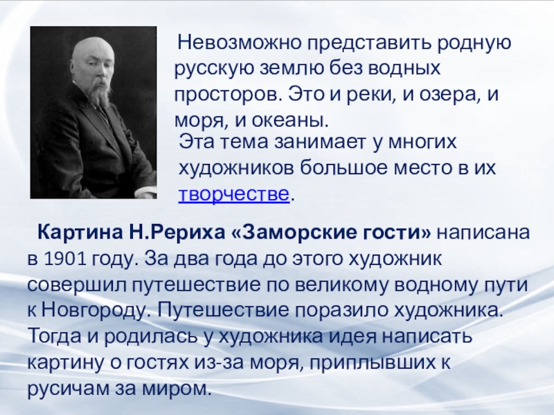 Картина Н.Рериха «Заморские гости» написана в 1901 году. За два года до этого художник совершил путешествие по великому водному пути к Новгороду. Путешествие поразило художника. Тогда и родилась у художника идея написать картину о гостях из-за моря, приплывших к русичам за миром.