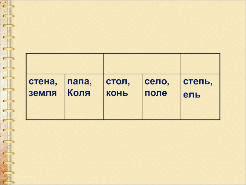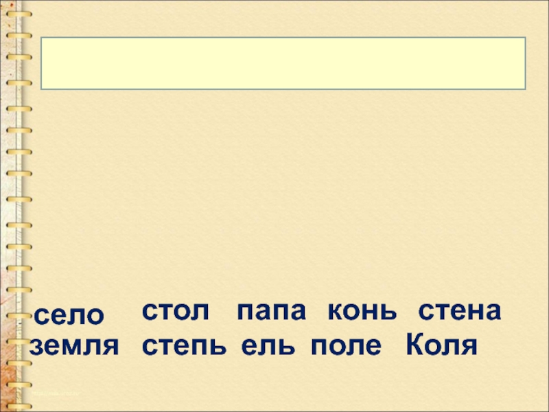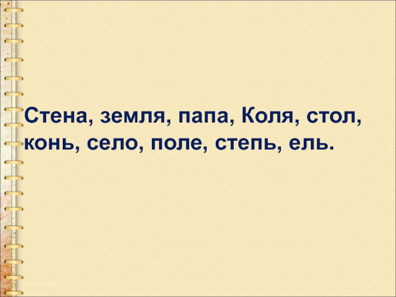 Стена, земля, папа, Коля, стол, конь, село, поле, степь, ель.