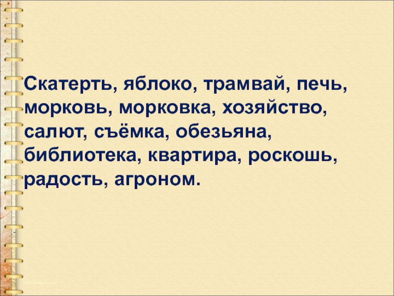 Слайд 14Скатерть, яблоко, трамвай, печь, морковь, морковка, хозяйство, салют, съёмка, обезьяна, библиотека,