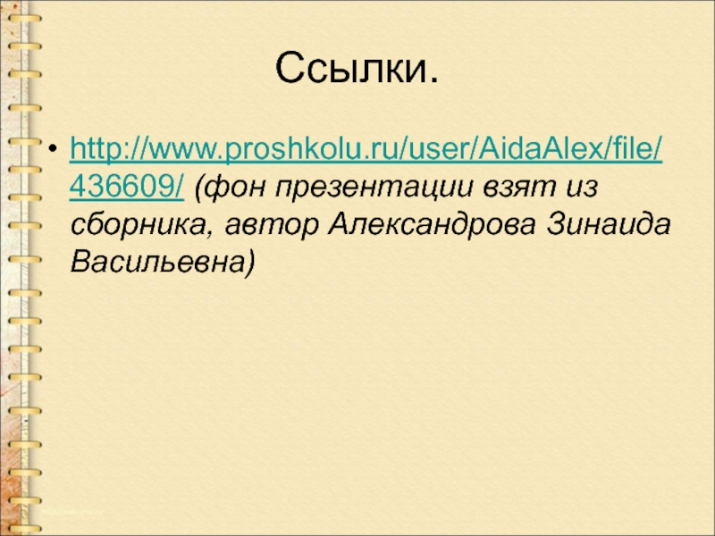 Ссылки.http://www.proshkolu.ru/user/AidaAlex/file/436609/ (фон презентации взят из сборника, автор Александрова Зинаида Васильевна)