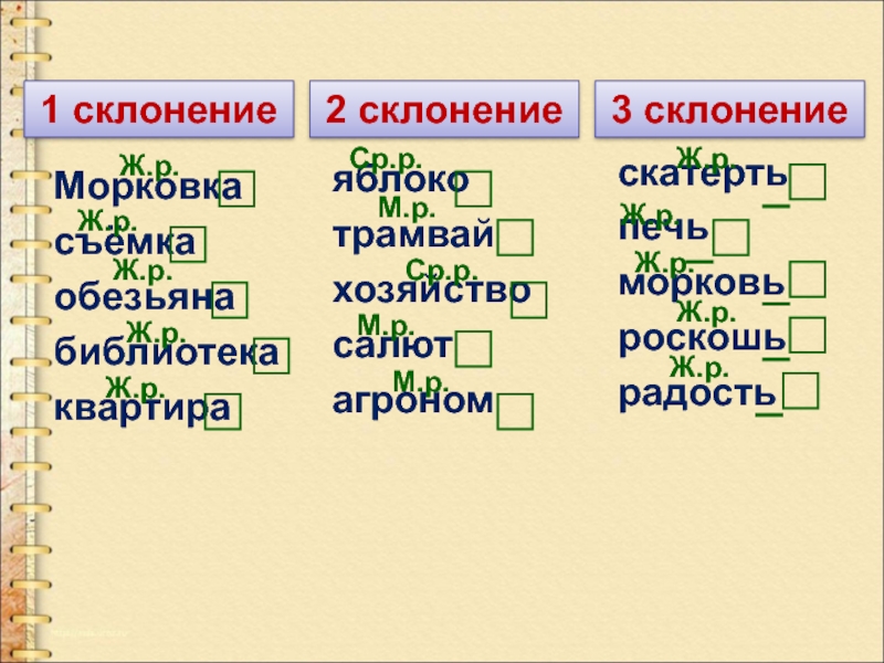 1 склонение2 склонение3 склонениеМорковкасъёмкаобезьянабиблиотекаквартираяблокотрамвайхозяйствосалютагрономскатертьпечьморковьроскошьрадостьЖ.р.Ж.р.Ж.р.Ж.р.Ж.р.Ср.р.М.р.Ср.р.М.р.М.р.Ж.р.Ж.р.Ж.р.Ж.р.Ж.р.