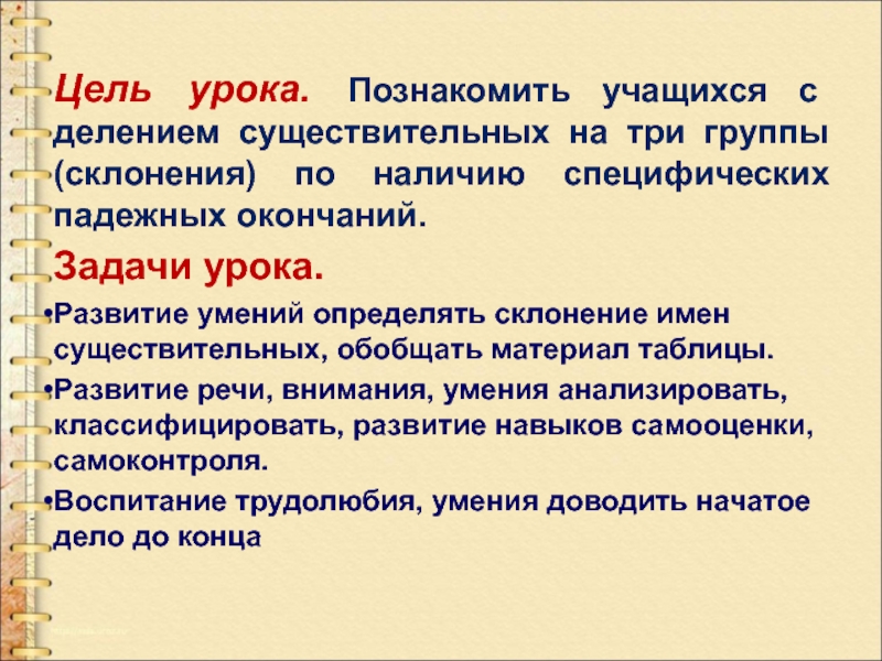 Цель урока. Познакомить учащихся с делением существительных на три группы (склонения) по наличию специфических падежных окончаний.Задачи урока.