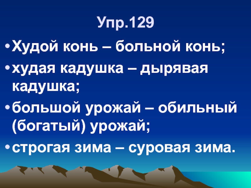 Упр.129Худой конь – больной конь; худая кадушка – дырявая кадушка; большой урожай – обильный (богатый) урожай; строгая