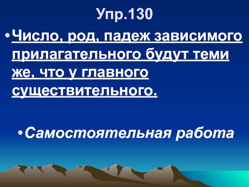 Упр.130Число, род, падеж зависимого прилагательного будут теми же, что у главного существительного. Самостоятельная работа