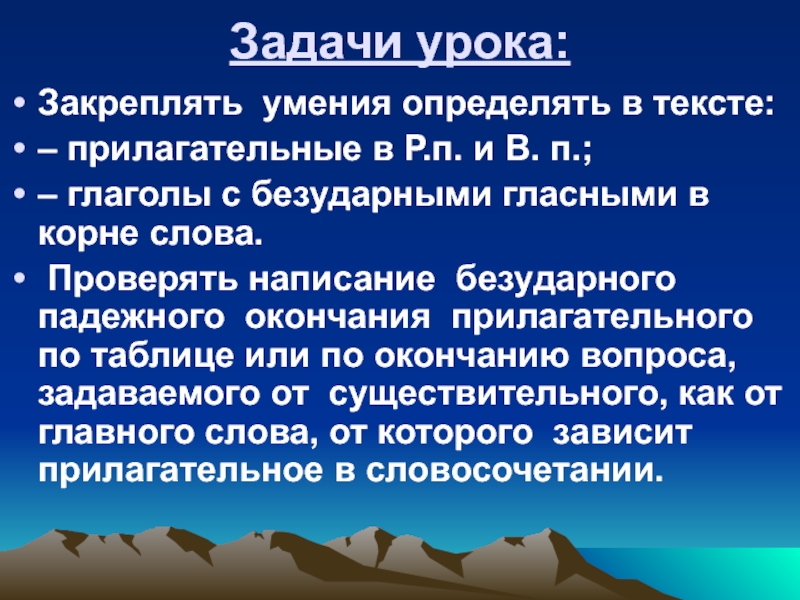 Задачи урока: Закреплять умения определять в тексте: – прилагательные в Р.п. и В. п.; – глаголы с безударными гласными в корне слова. Проверять написание безударного падежного окончания прилагательного по таблице или по окончанию вопроса, задаваемого от