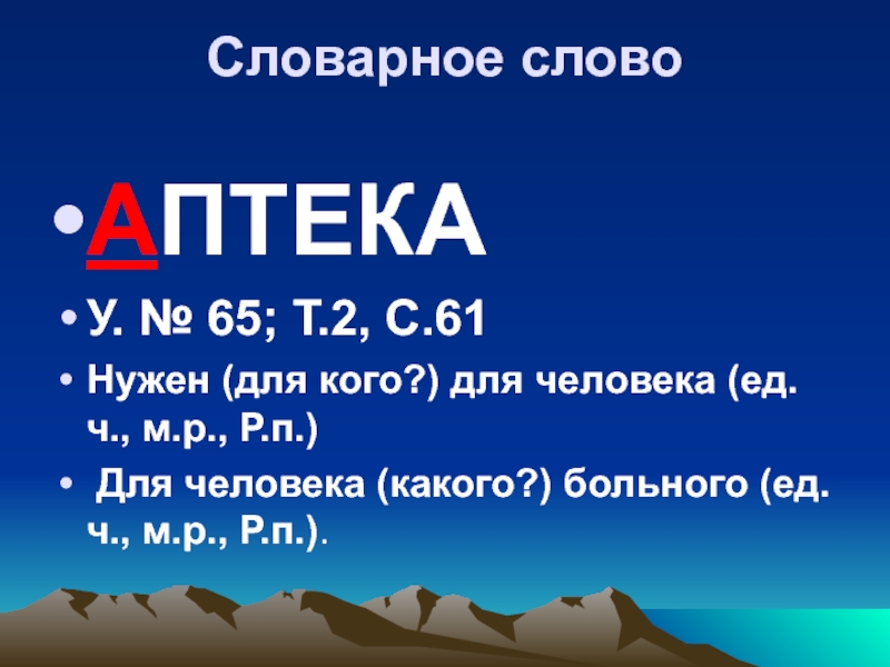 Словарное слово АПТЕКА У. № 65; Т.2, С.61 Нужен (для кого?) для человека (ед.ч., м.р., Р.п.)