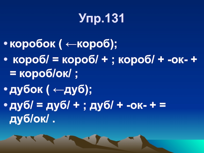Упр.131коробок ( ←короб); короб/ = короб/ + ; короб/ + -ок- + = короб/ок/ ; дубок (