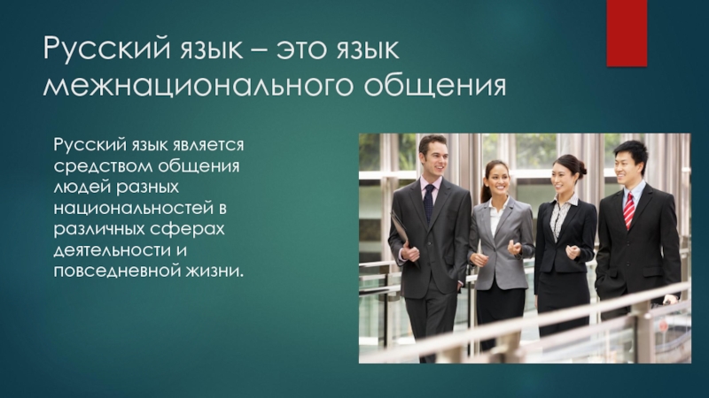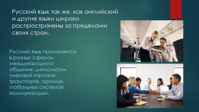 Русский язык применяется в разных сферах международного общения: дипломатии, мировой торговле, транспорте, туризме, глобальных системах коммуникации.