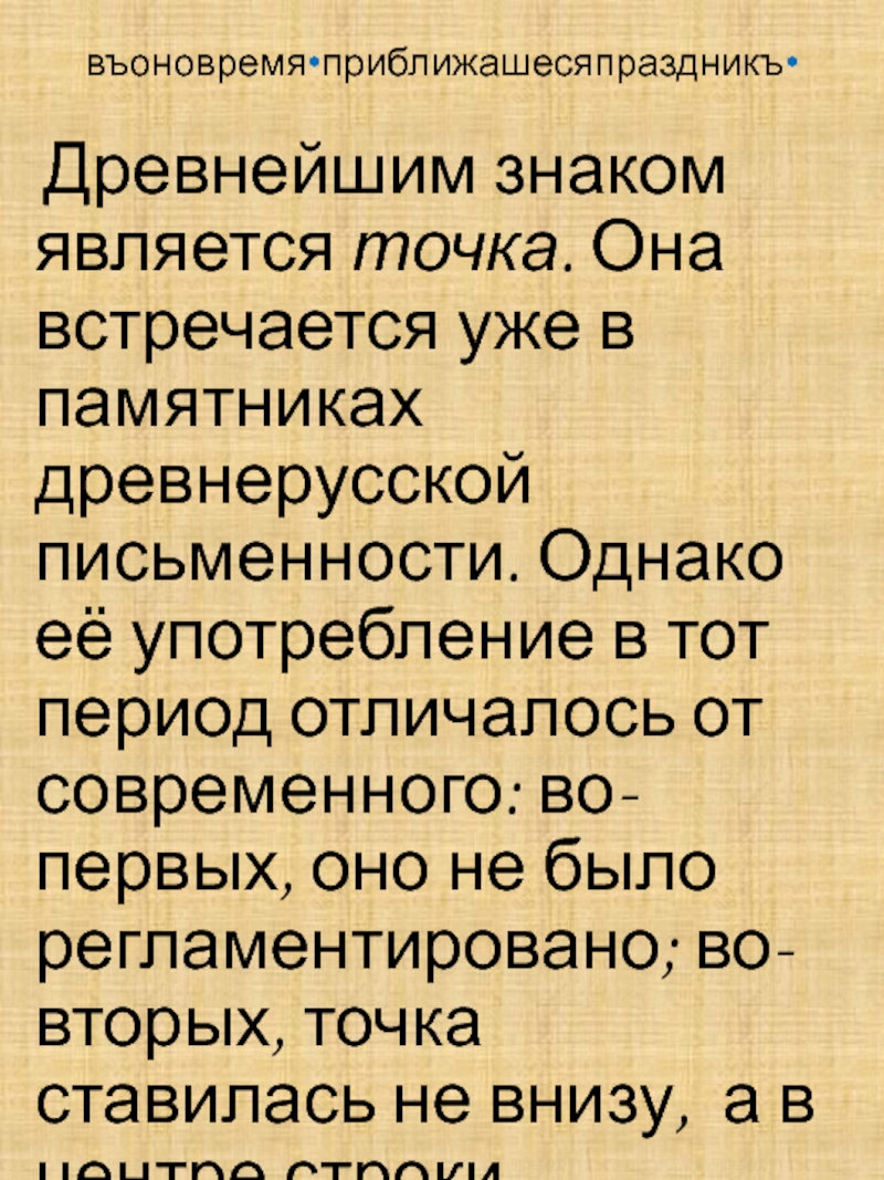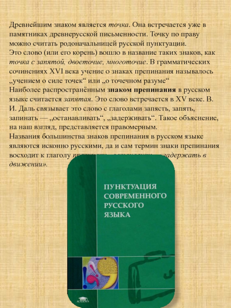 Слайд 6Древнейшим знаком является точка. Она встречается уже в памятниках древнерусской письменности.