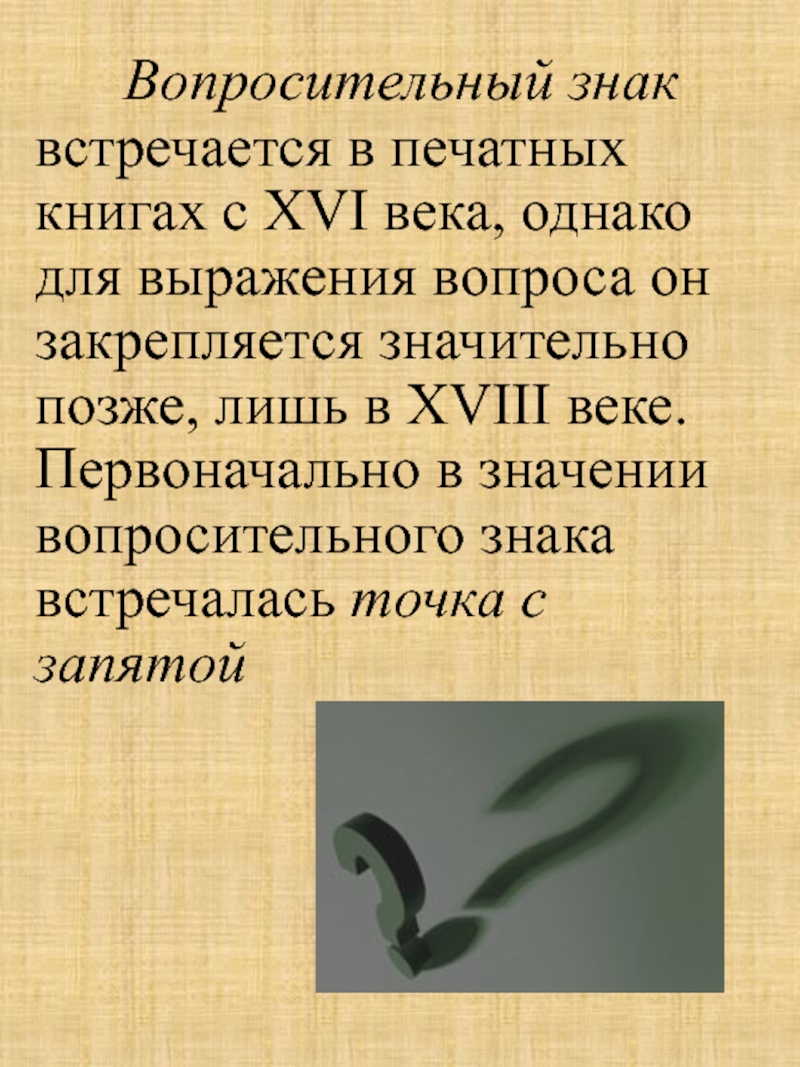 века, однако для выражения вопроса он закрепляется значительно позже, лишь в XVIII веке. Первоначально в значении вопросительного знака встречалась точка с запятой