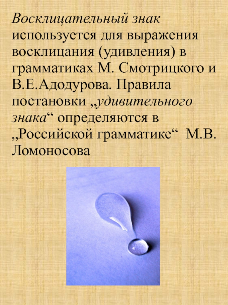 Слайд 16Восклицательный знак используется для выражения восклицания (удивления) в грамматиках М. Смотрицкого